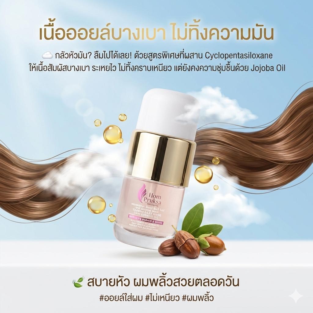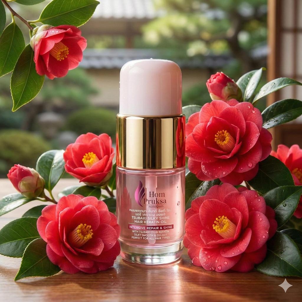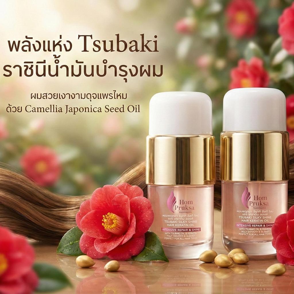Hom Pruksa Tsubaki Silky Shine Hair Keratin Oil (หอมพฤกษา สึบากิ ซิลกี้ ไชน์ แฮร์ เคราติน ออยล์) ผลิตภัณฑ์บำรุงเส้นผมเนื้อออยล์บางเบา สูตรไม่ต้องล้างออก ที่รวมพลังของสารสกัดธรรมชาติและนวัตกรรมทางวิทยาศาสตร์เข้าด้วยกัน เพื่อดูแลเส้นผมของคุณให้ดูสุขภาพดี จัดทรงง่าย ไม่พันกัน